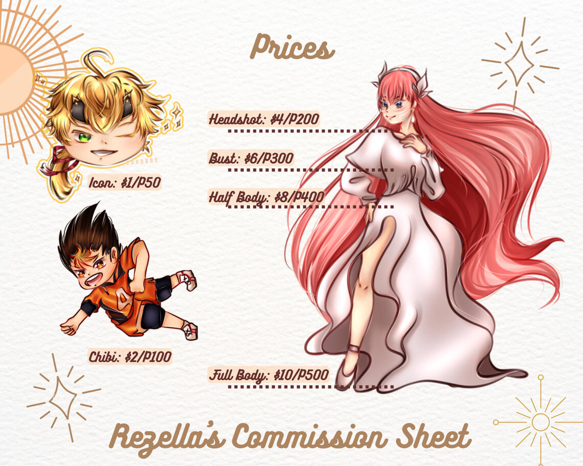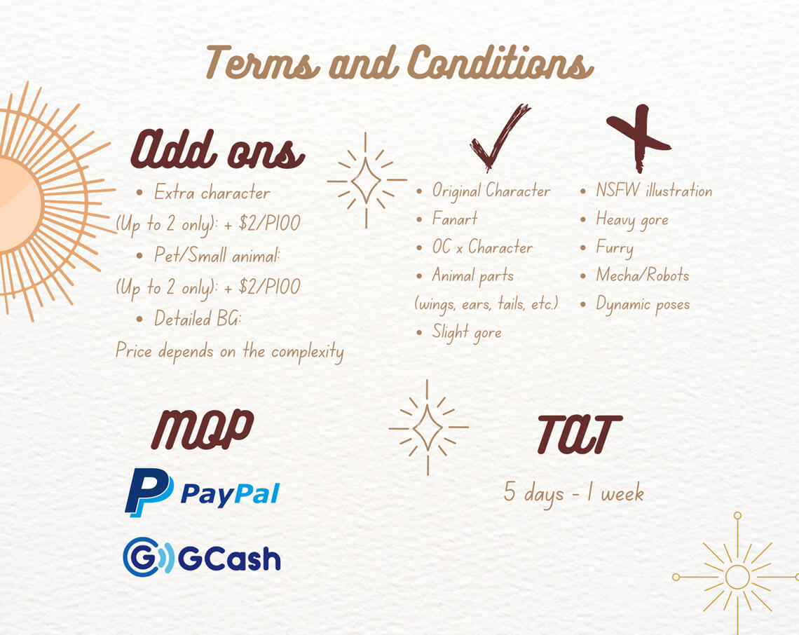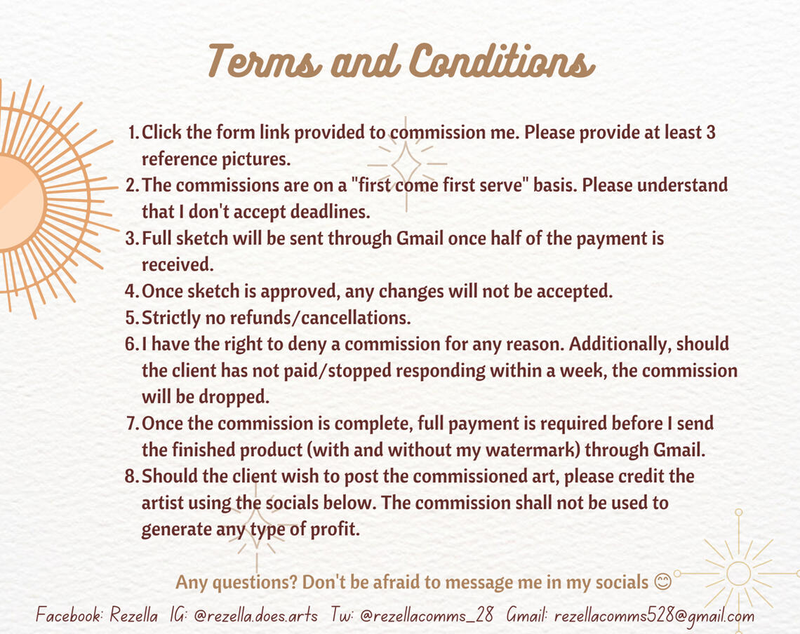 2) Progress/Screenshots/Speedpaint of your commission- I will work on a "first come, first served" basis. As a result, it can take me some time to accommodate you. Even so, I will keep you updated on your status in the queue.- The turnaround time is between 5 and 7 days. No deadlines shorter than that, therefore I ask that you be patient with your commission. Give me adequate time to work on your commission if you wish for the best quality.- I have the right to refuse a commission for any reason. Both the artist and the client should be considerate of one another's privacy and opinions.- The more descriptive, the better. I ask that you send me at least three reference images, such as your character sheet, aesthetics, or a quick sketch that will help me envision your commission. You can also choose a piece of work from my portfolio to exemplify the style you want for your commission. (For more samples, click the paintbrush below)- You are welcome to request clarifications, changes, etc. I would be more than happy to explain everything to you. We should cooperate as much as possible.- Changes can only be made during the sketching phase. Any additional revisions made after the initial approval of the sketch will not be allowed.- You have the option of paying in full up ahead or paying half before I start on your commission. The remaining 50% is due before I send you the finished product.- Once I start working on your commission, there are absolutely no refunds or cancellations allowed. Please do not commission me if you are hesitant or believe you may need the money for another purpose.- Should the client not have paid or stopped responding within a week, I will forfeit the commission.- I won't draw in other art styles. When you commission me, you are paying for my art style. Even so, I'm always open to feedback and advice to improve as an artist.- Should the client wish to share the commissioned artwork, please give the artist credit by tagging me on the social media links below. The commissioned art shall not be used to make any profit. I put a lot of effort into it, so please be gentle with it. (〃` 3′〃)